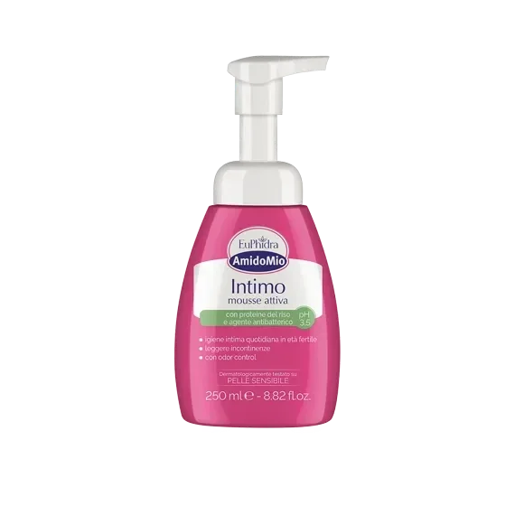 Euphidra Amidomio Intimo Mousse Attiva PH 3,5 250ml è un detergente in mousse per l'igiene intima quotidiana con antibatterico naturale e odor control. Il pH nettamente acido ostacola la contaminazione batterica e aiuta a bilanciare il pH fisiologico in caso di alterazioni, spesso collegate ad un aumento di estrogeni: età fertile, ciclo mestruale, gravidanza.