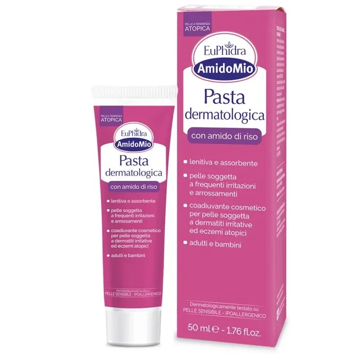 Euphidra Amidomio Pasta Dermatologica idrata e lenisce la pelle caratterizzata da irritazioni ed arrossamenti. La pasta dalla texture porosa e non occlusiva, lascia respirare la pelle e favorisce la riparazione e la rigenerazione cutanea. Inoltre mantiene la pelle asciutta e protetta, preservandola dall'umidità e da agenti atmosferici, quali raggi solari e freddo, da frequenti lavaggi e da altri irritanti di natura fisico-chimica.